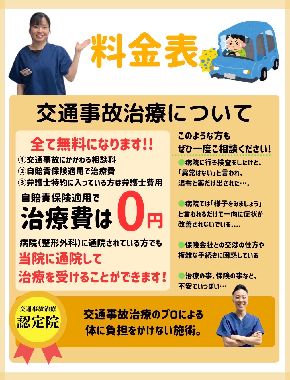 当院は「厚生労働省に認可」されている交通事故治療院なため、自賠責保険が適応されます。そのため交通事故による施術費は一切かかりません。