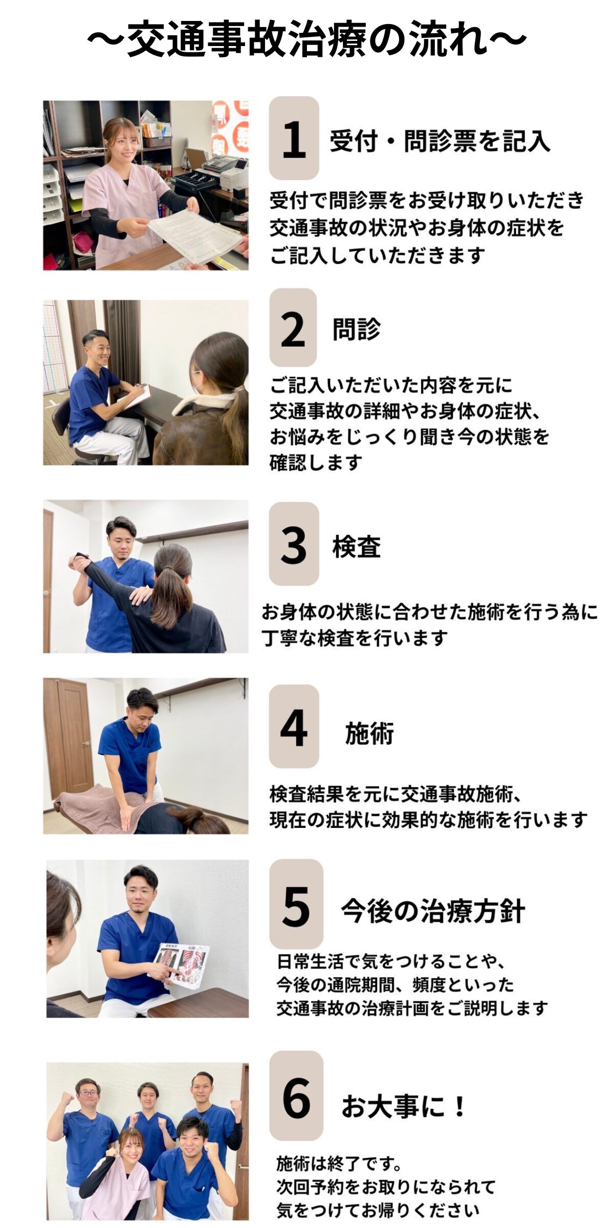 こちらにも記載していますが、交通事故施術はできるだけ早く開始することがポイントです。痛みや違和感がある場合は、整骨院や医療機関を受診しましょう。